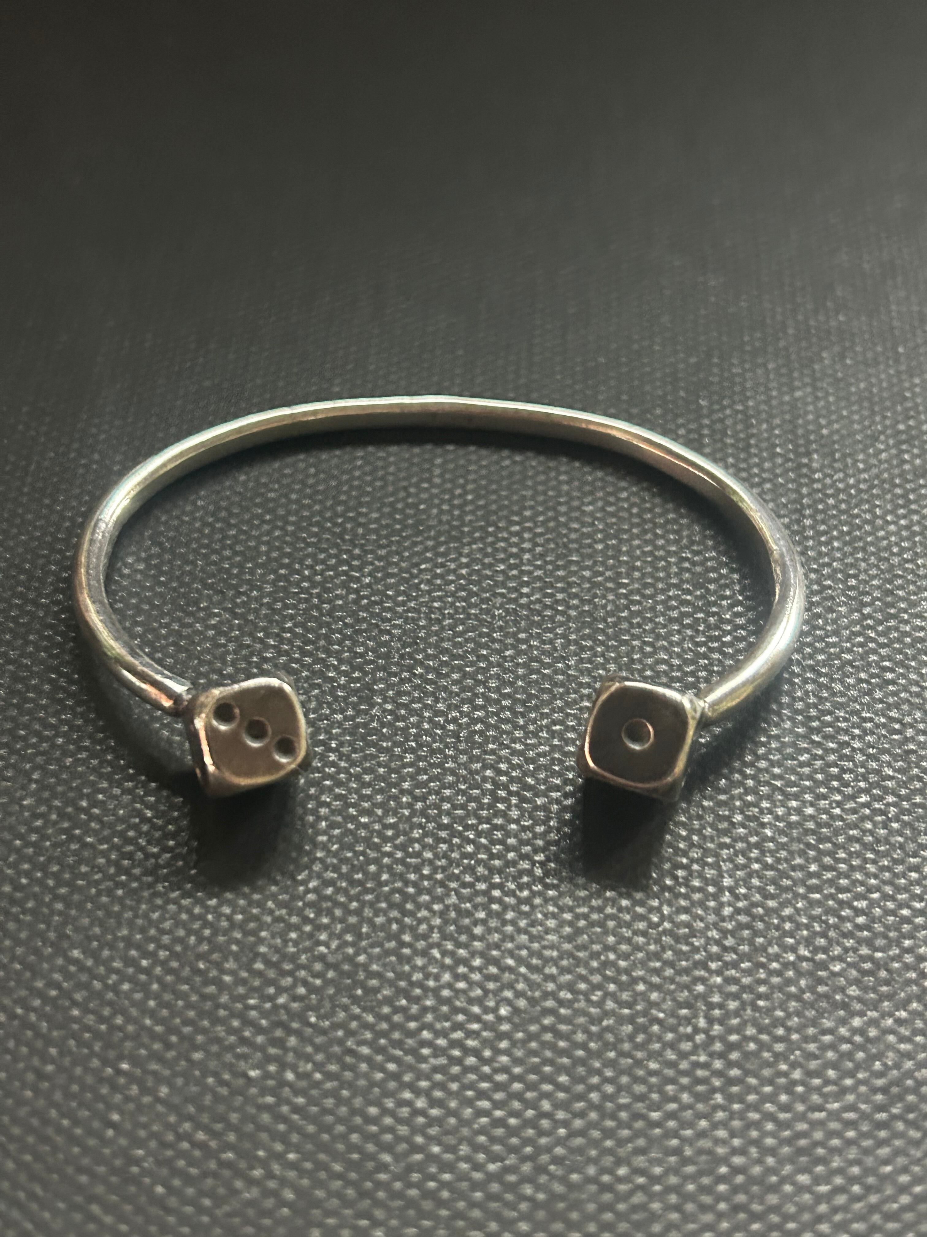 両サイドにdiceを配置したバングルです。細身ながらも存在感のあるデザイン。腕元のアクセントに、重ね付けもいい感じです。こちらのサイズは小さめとなっております。女性、手首細めの男性向けです。
