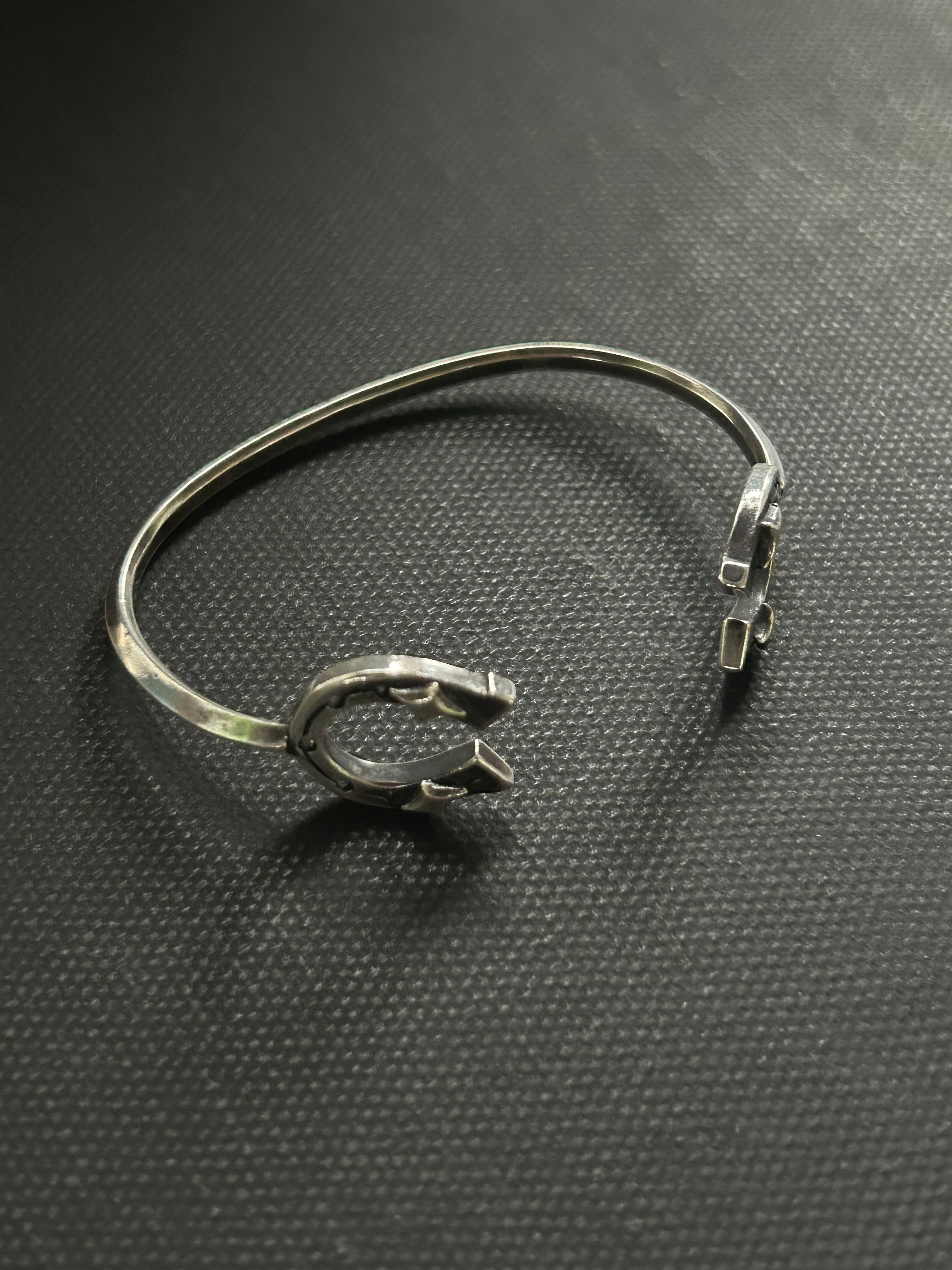 両サイドにhorseshoeを配置したバングルです。細身ながらも存在感のあるデザイン。腕元のアクセントに、重ね付けもいい感じです。こちらのサイズは小さめとなっております。女性、手首細めの男性向けです。