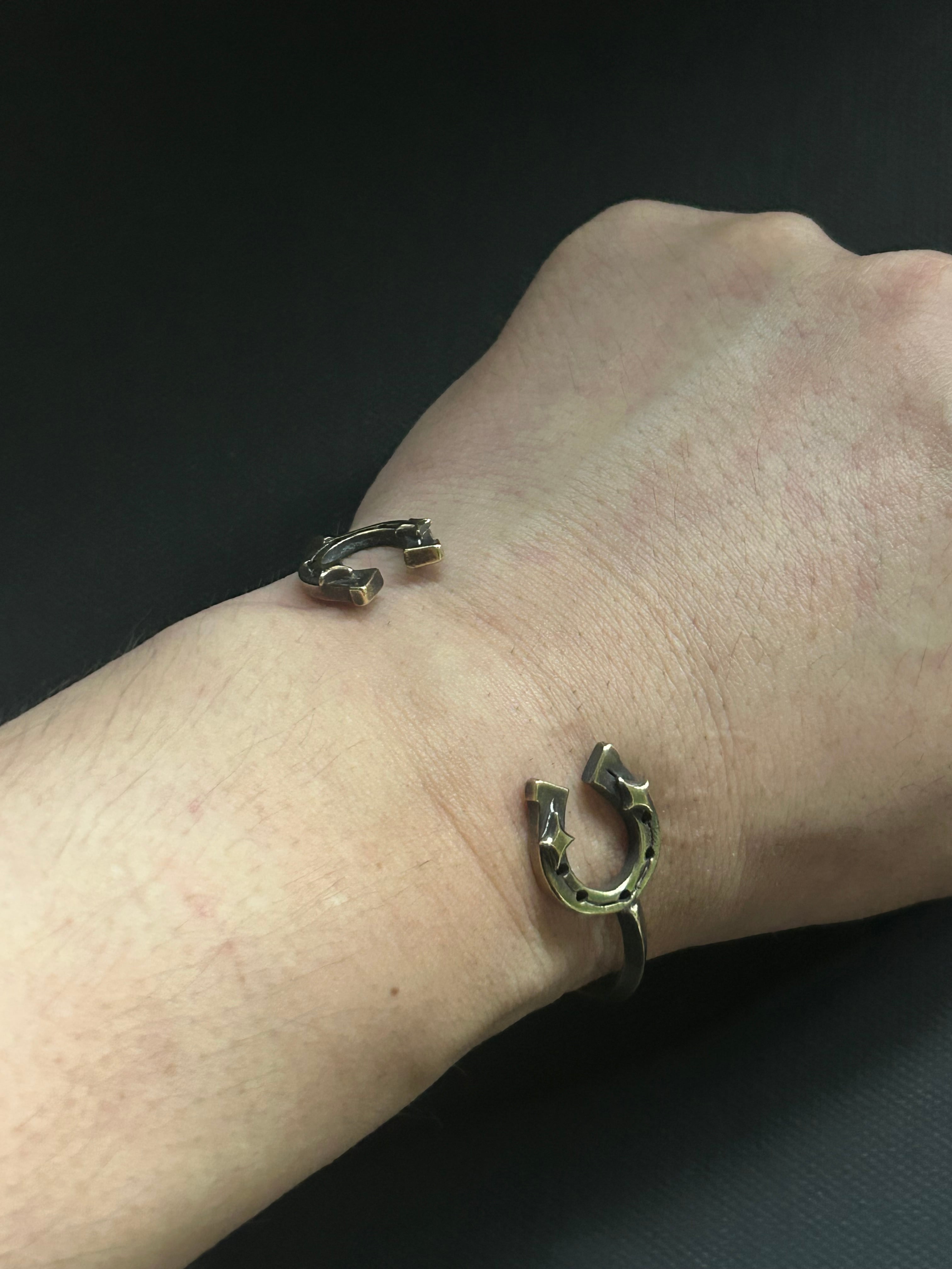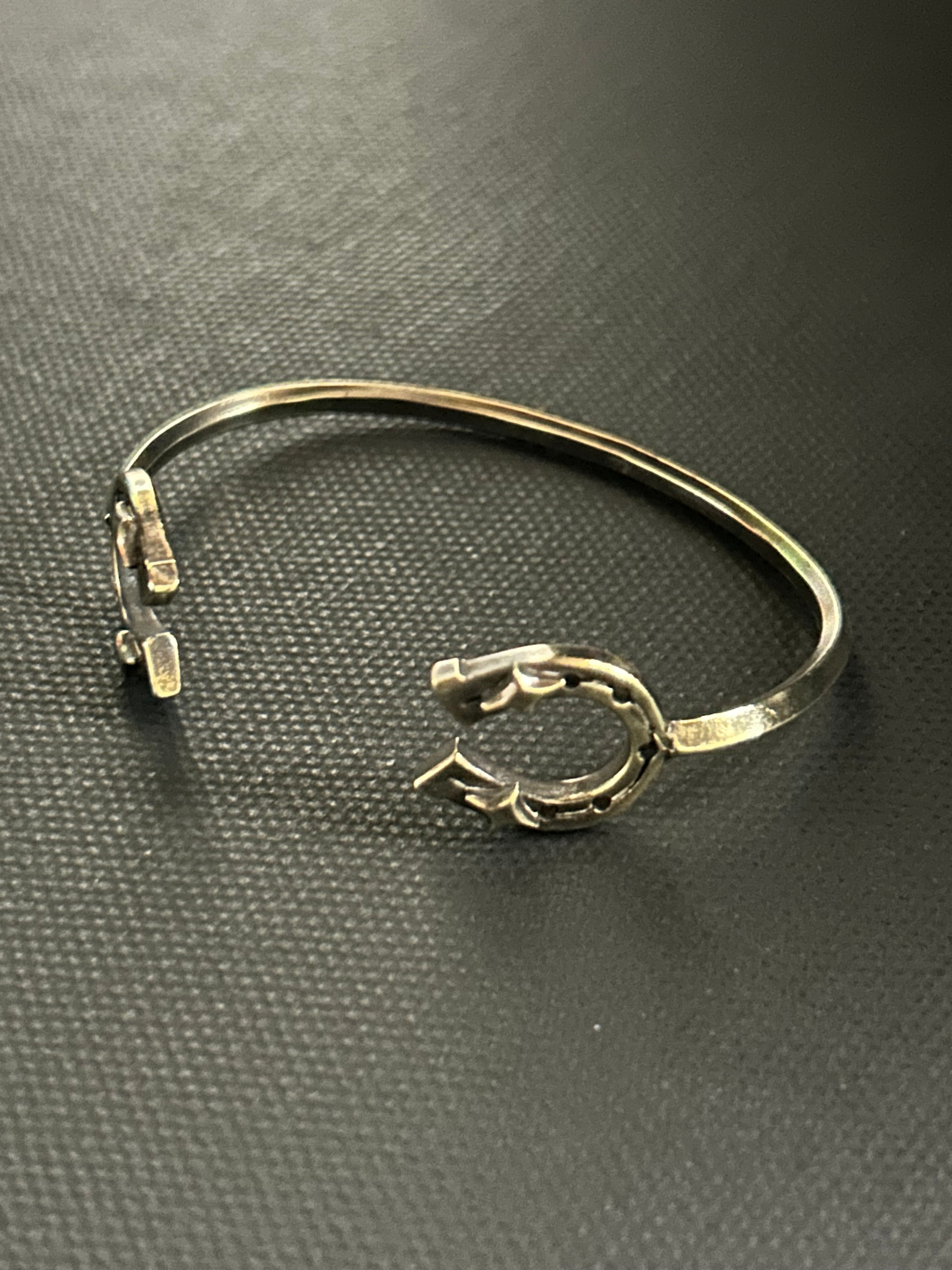 両サイドにhorseshoeを配置したバングルです。細身ながらも存在感のあるデザイン。腕元のアクセントに、重ね付けもいい感じです。こちらのサイズは小さめとなっております。女性、手首細めの男性向けです。