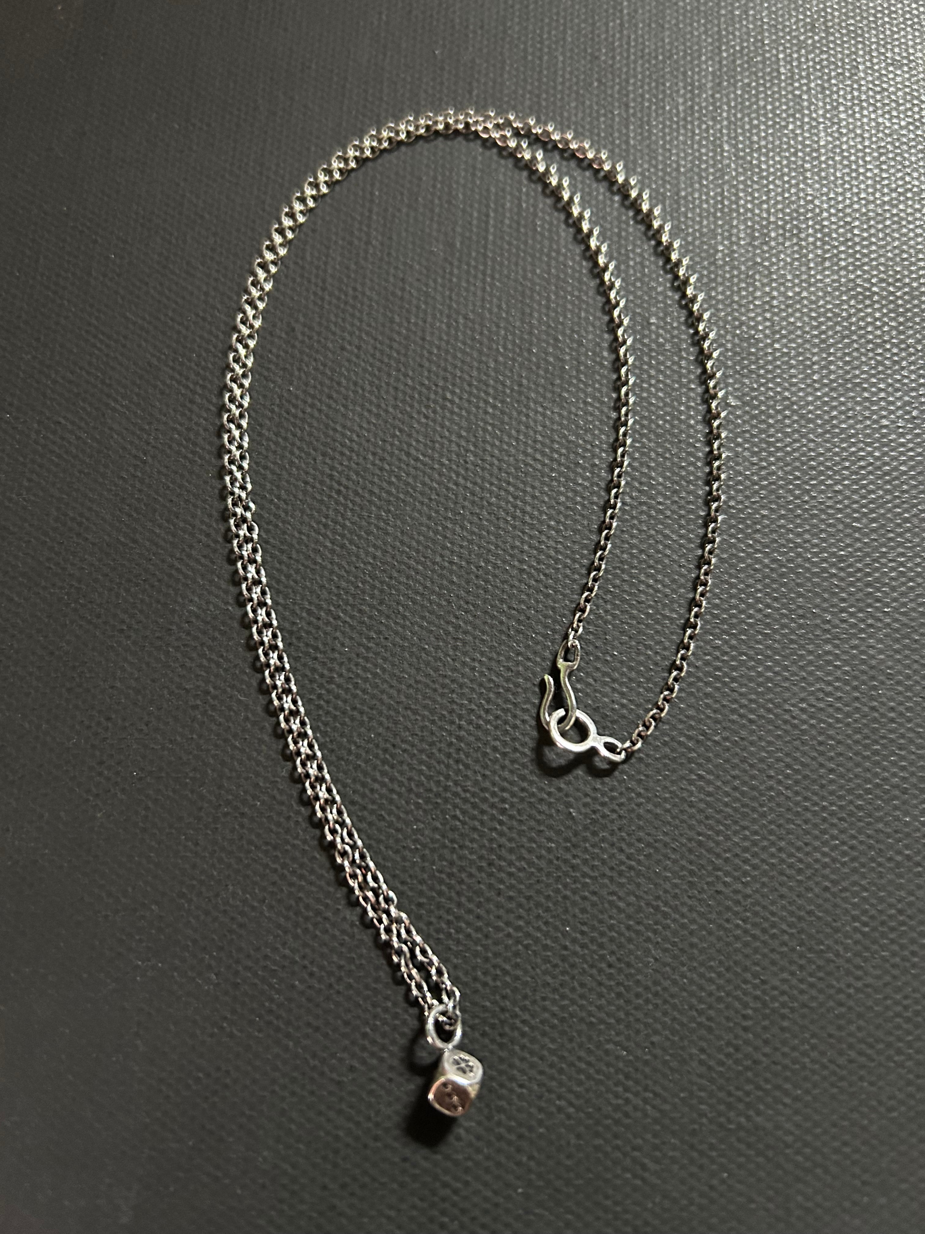 小ぶりのdiceをモチーフとしたペンダントトップに、細身の小豆チェーンをセットし、ビンテージライクな仕上げを施したデザインのネックレスです