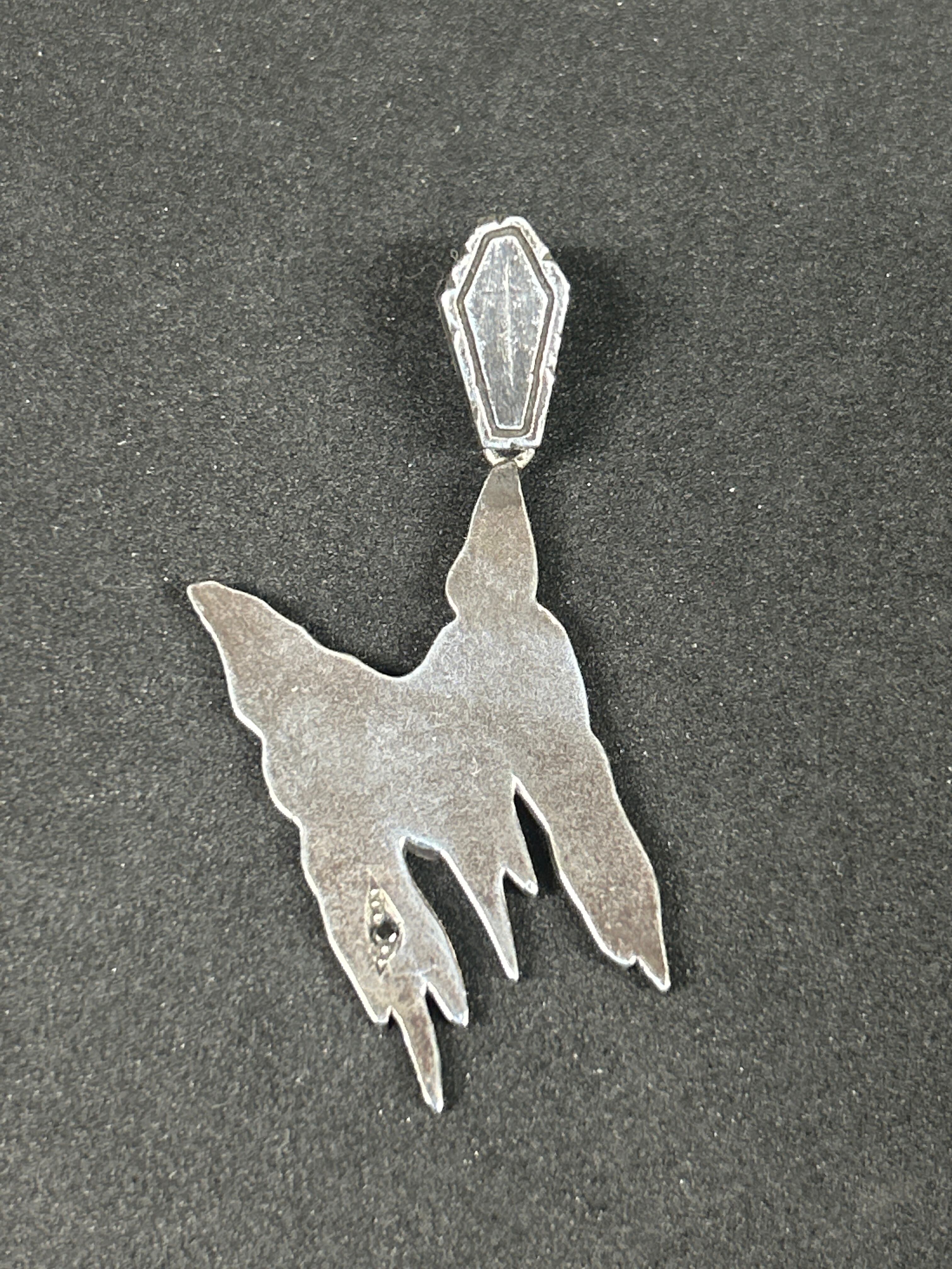 血文字デザインのペンダントトップ。バチカン部分はcoffinをモチーフ。他のcoffinとは違うデザインとなっております。文字本体に天然Black Diamondを血が滴る感じにセットしてあります。石を付けることで特別な一点となっております。ロック色の中に少しのゴージャスさを。