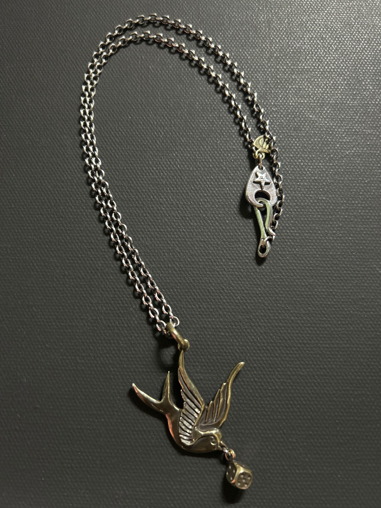大きめのswallowのペンダントトップ。ワンポイントでdiceを咥えています。存在感と着け心地は抜群だと思います。