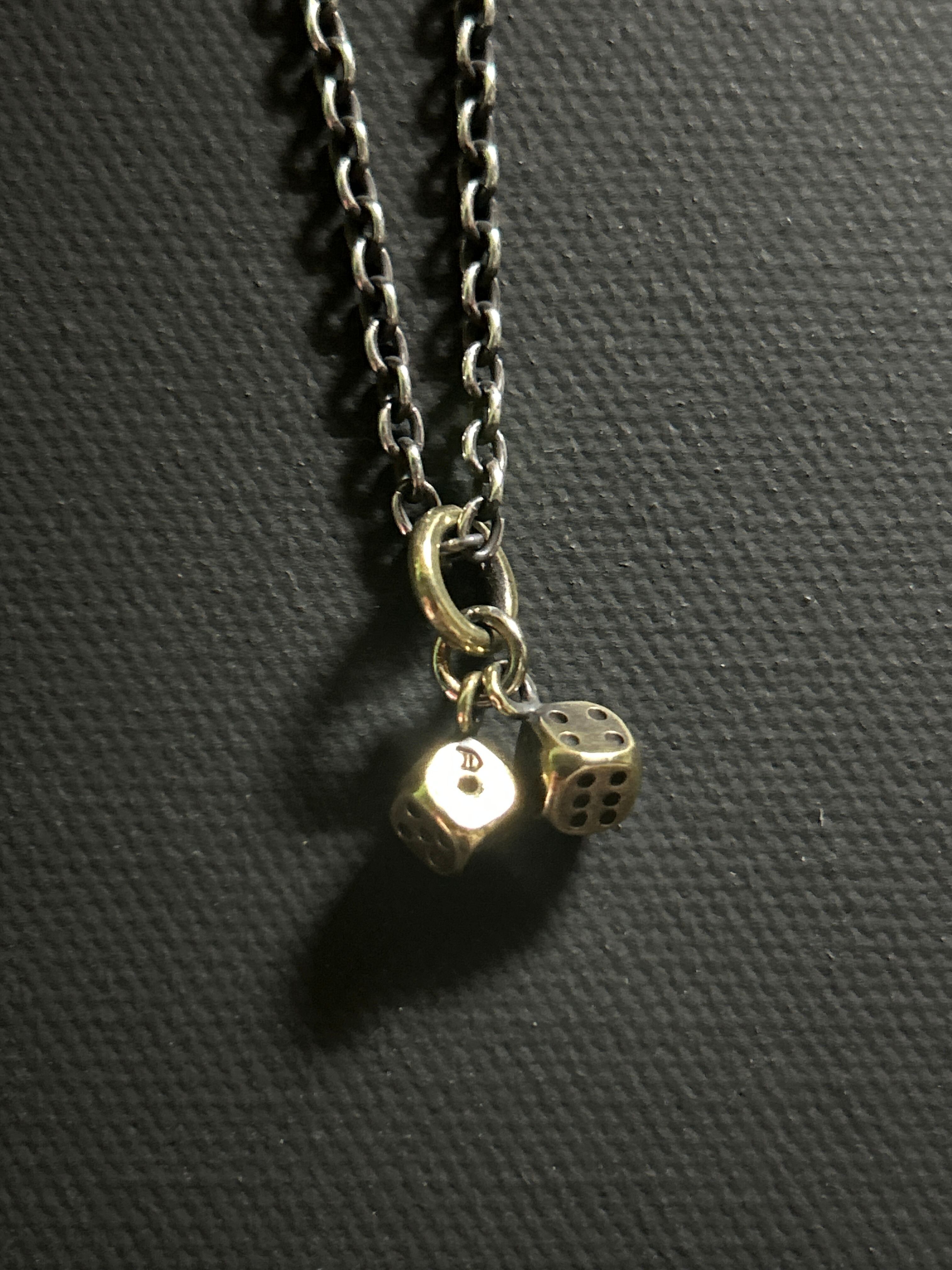 小振りのdiceを2セットさせたペンダントトップ。ビンテージライクな仕上げで作成しました。単体付けで、さりげなくワンポイントのアクセントに。シンプルで付けやすいです。