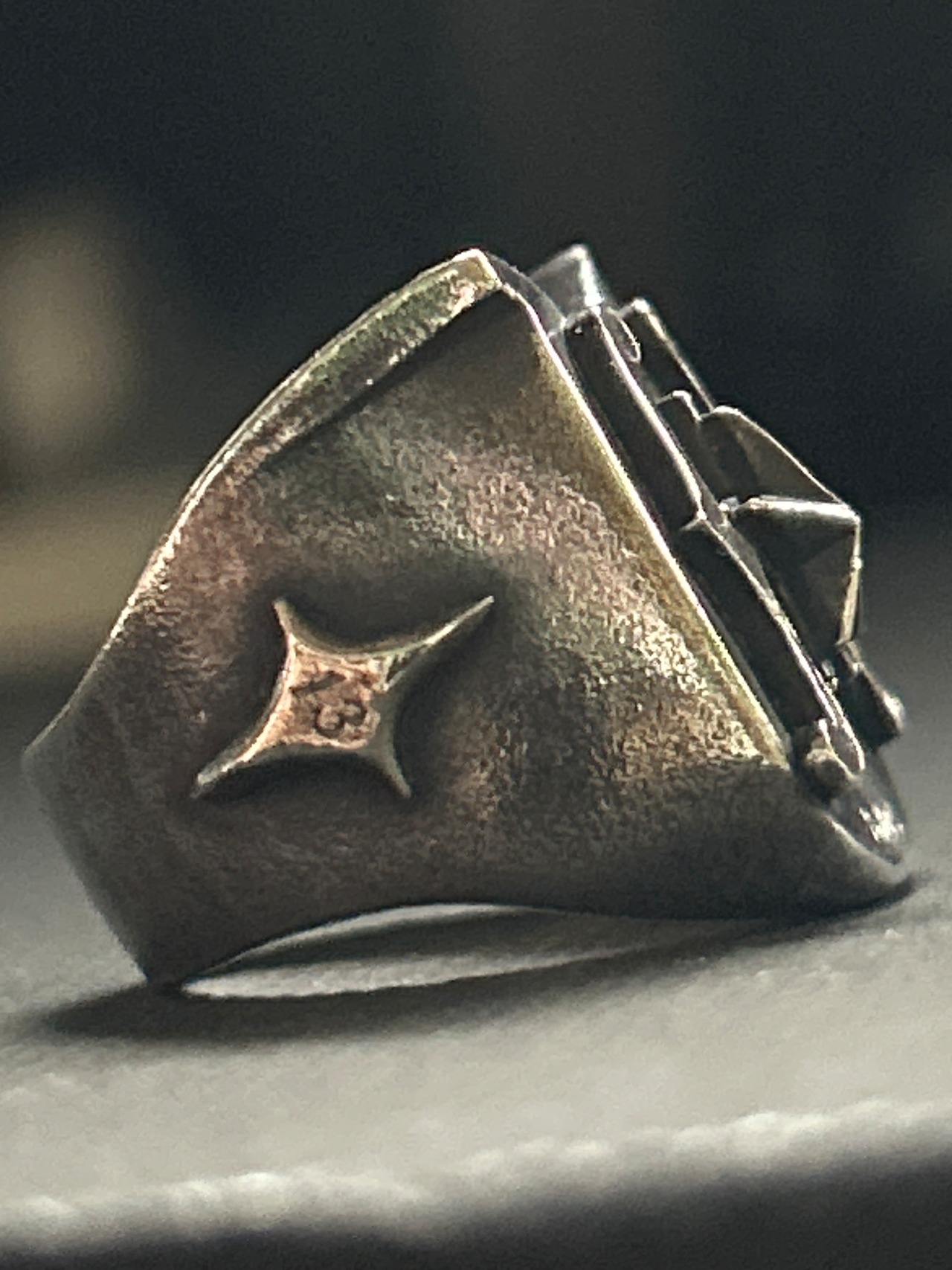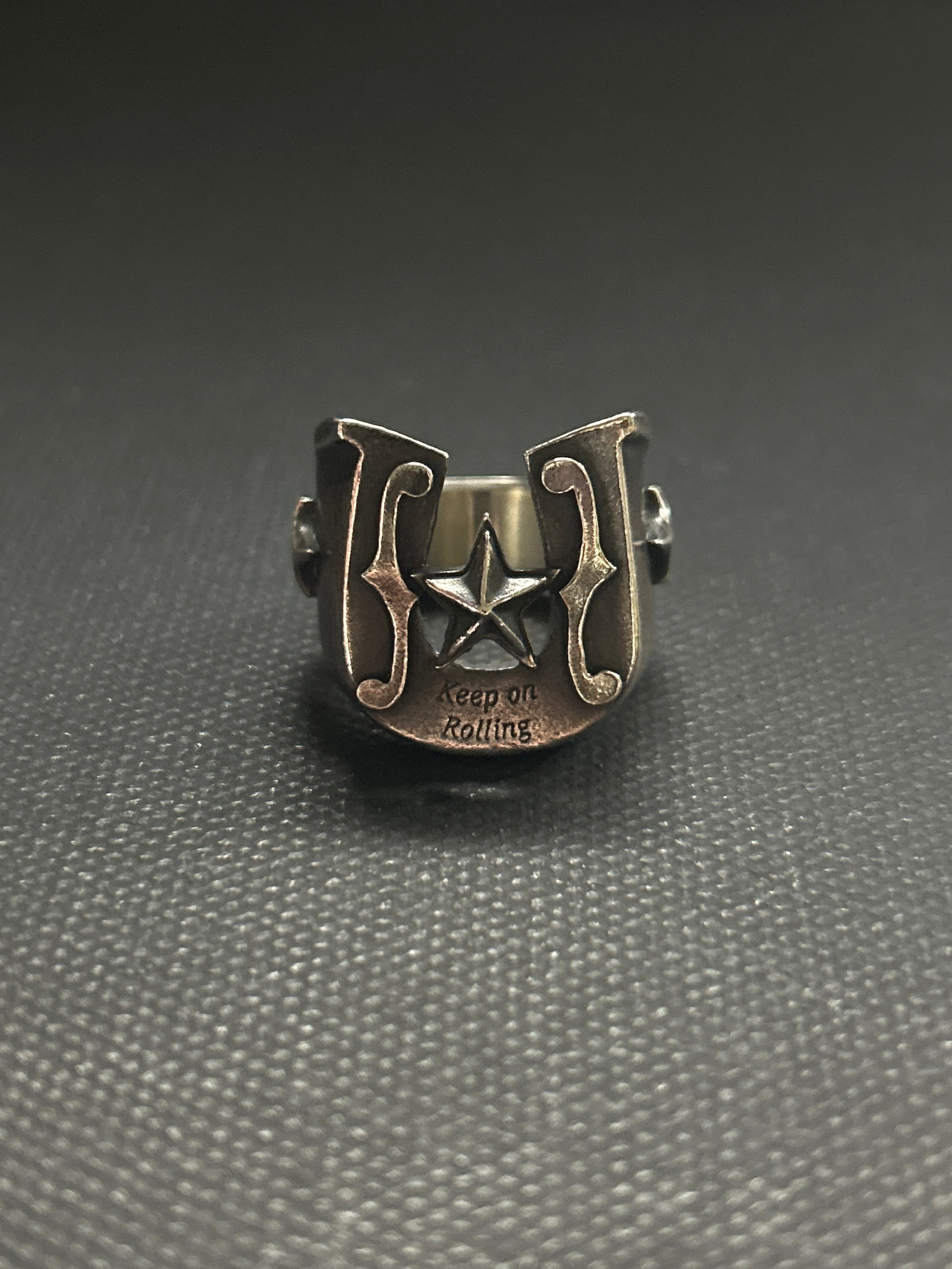 ホースシューデザインのリング。madeindirtyらしくを強調し、正面あるkeep on rollingには意味を込め刻印致しました。細かな部分までrock cultureに作成致しました。